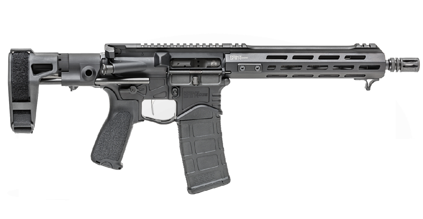 The Springfield Saint Edge 5.56mm Semi-Automatic Pistol is a factory-built AR-style pistol that prioritizes balance, recoil management, and rapid target acquisition. It features a 5.56 NATO chamber, a nickel boron coated bolt carrier group, and a proprietary two-stage trigger designed for a crisp break and fast reset. The pistol includes an MLOK free-float handguard for accessory mounting, a low-profile gas block, and a stabilizing pistol brace. This configuration allows for effective shooting at extended pistol ranges while maintaining the compact profile needed for vehicle or home defense setups.