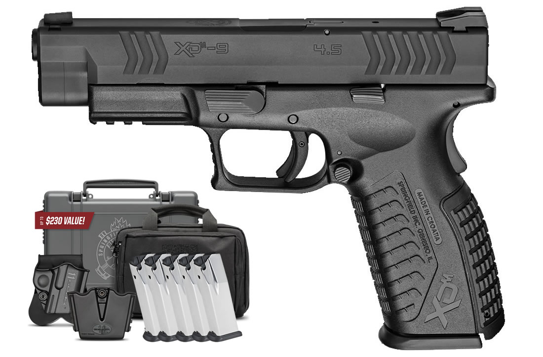 - Package contents: Springfield XDM 9mm 4.5 Full-Size Instant Gear Up Package with 5 Mags, Range Bag, Holster, M includes one pistol, five magazines, paddle holster, double magazine pouch, and padded range bag